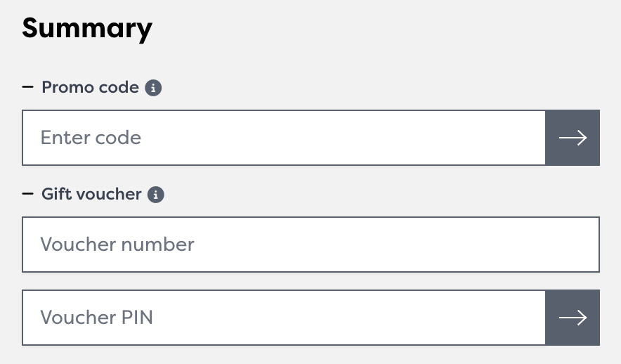 - Click the "+" and enter your Gift Voucher (number and pin) or Promotion Code and click the arrow.